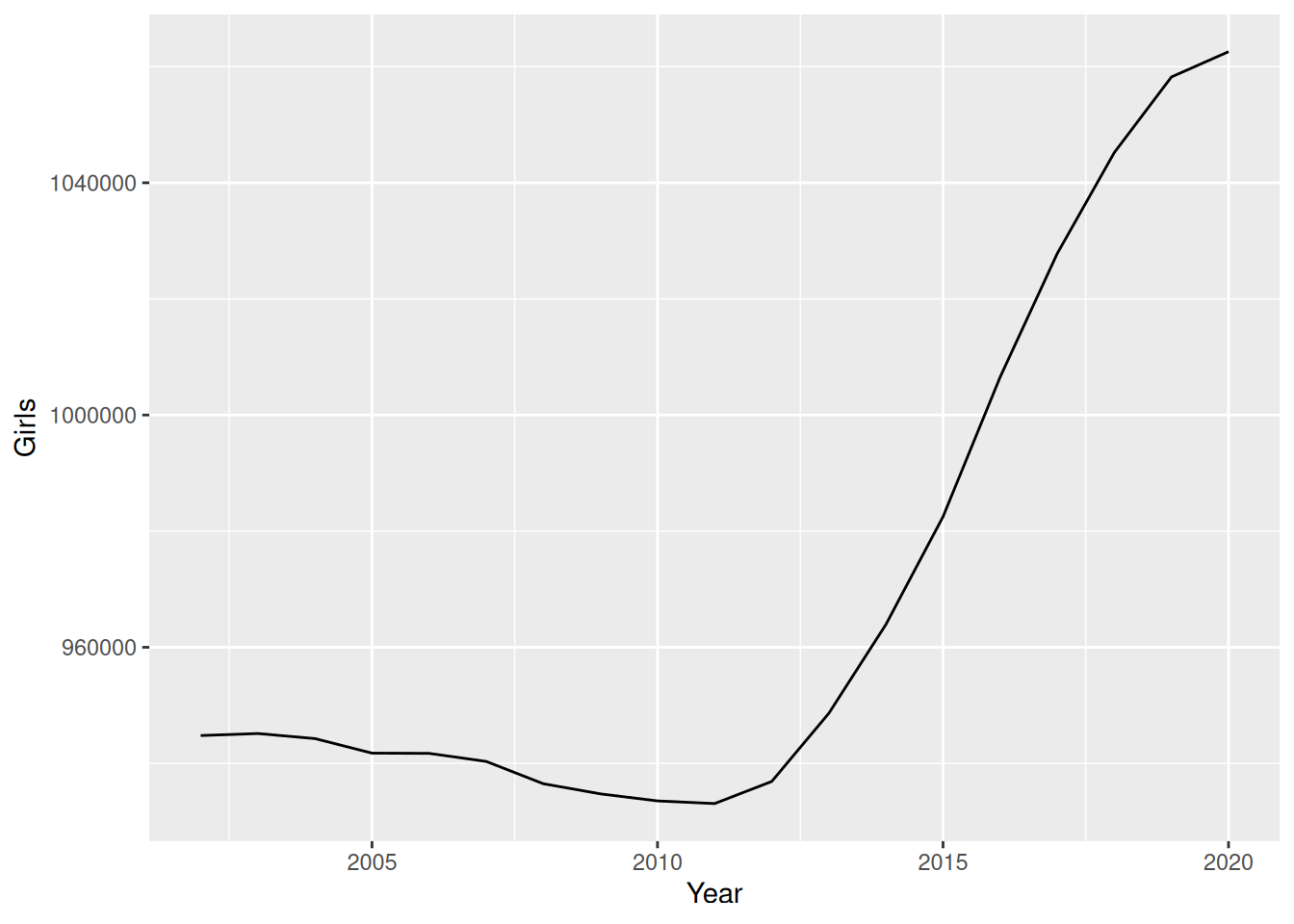 ggplot(my_view_df, aes(Year, Girls)) + geom_line()